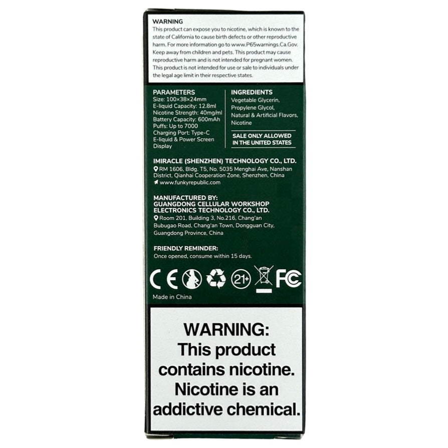 The Ti7000 is a testament to quality craftsmanship. From its sleek design to efficient internals, every aspect reflects Funky Republic's commitment to offering a premium vaping experience.