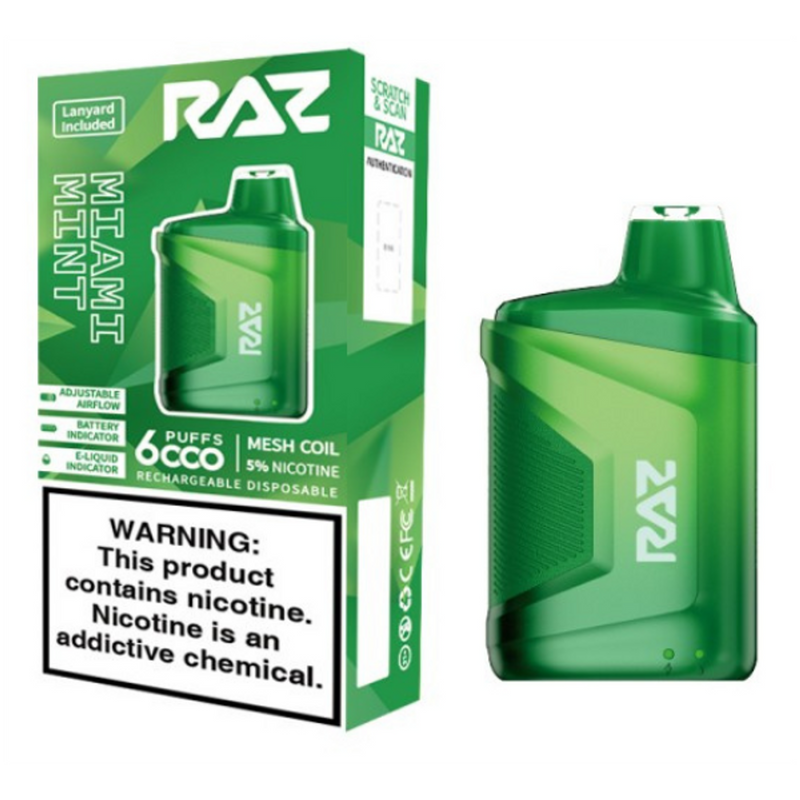 The Miami Mint - RAZ CA6000 isn’t just a device—it’s an experience. From its vibrant mint flavor to its long-lasting puff count, it redefines what a disposable vape can offer. Here’s what sets it apart: