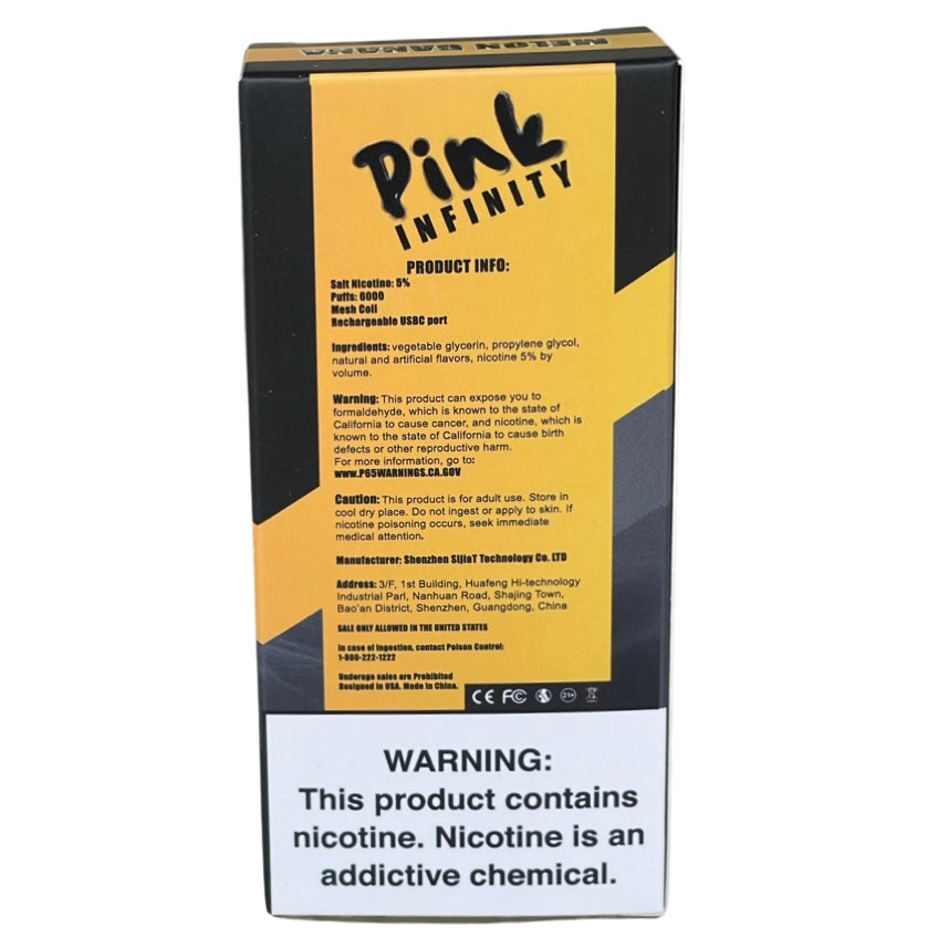 The Pink Infinity 6000 Melon Banana disposable vape is crafted with uncompromising quality and performance in mind. Each device is meticulously engineered to deliver a smooth and consistent vaping experience from the first puff to the last. Powered by a long-lasting battery and featuring a pre-filled e-liquid reservoir, this disposable vape ensures convenience without sacrificing performance, allowing you to savor the delicious flavor combination without any hassle.
