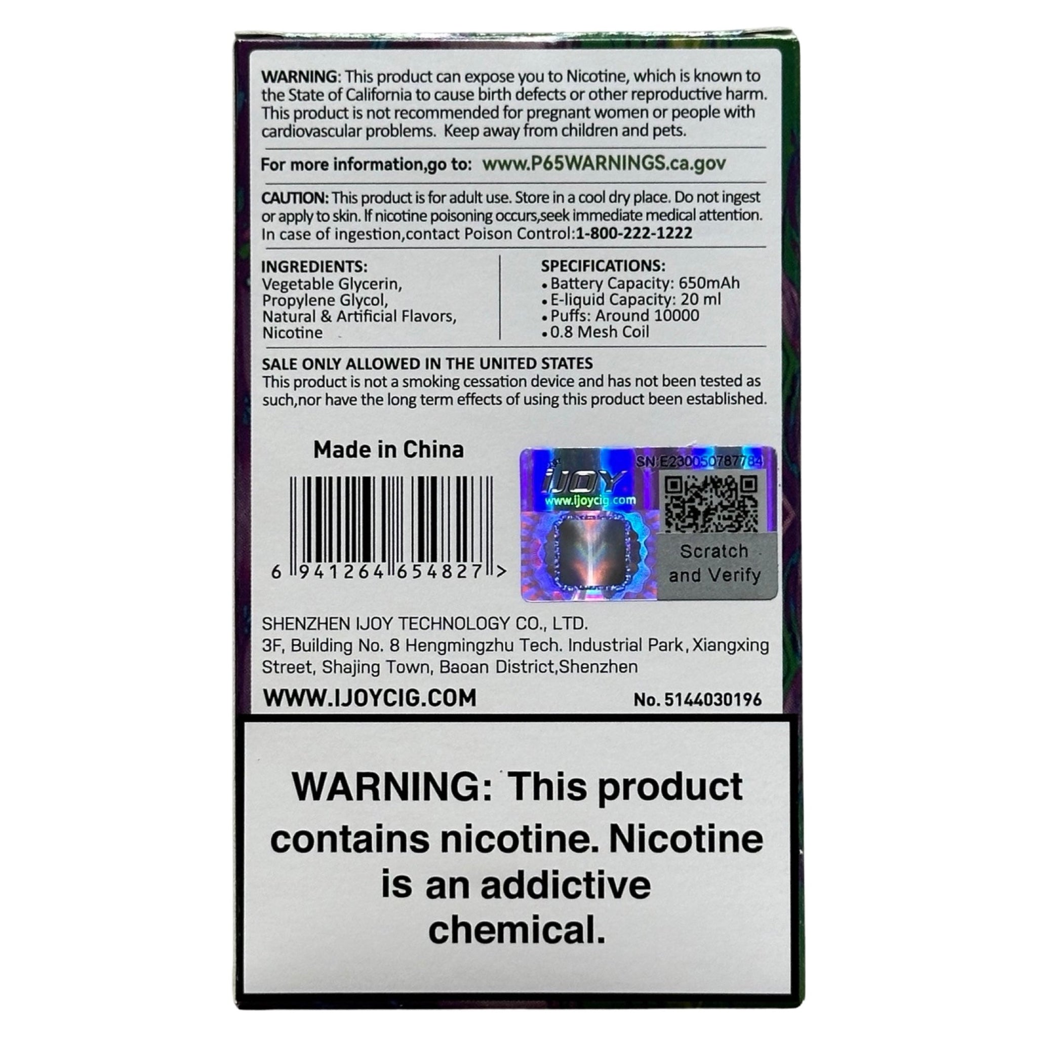 With a nicotine content of 5%, the IJOY 10000 provides a robust yet balanced nicotine experience. This level is ideal for those who seek a noticeable nicotine hit that harmoniously complements the sophisticated flavor blend.