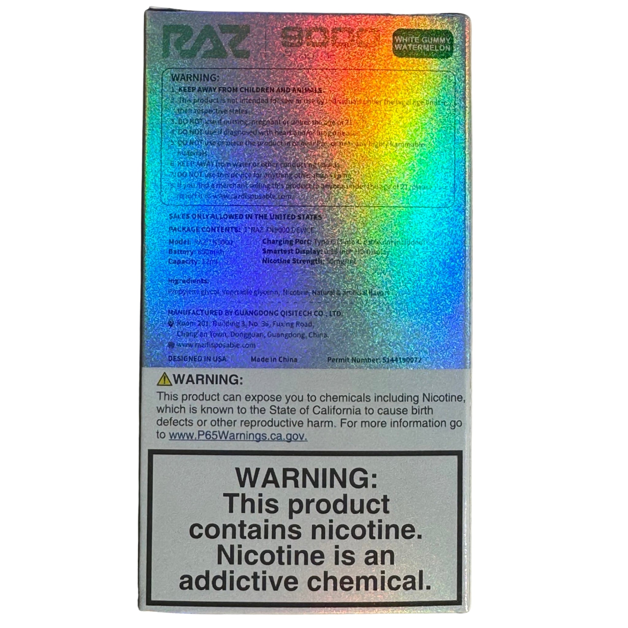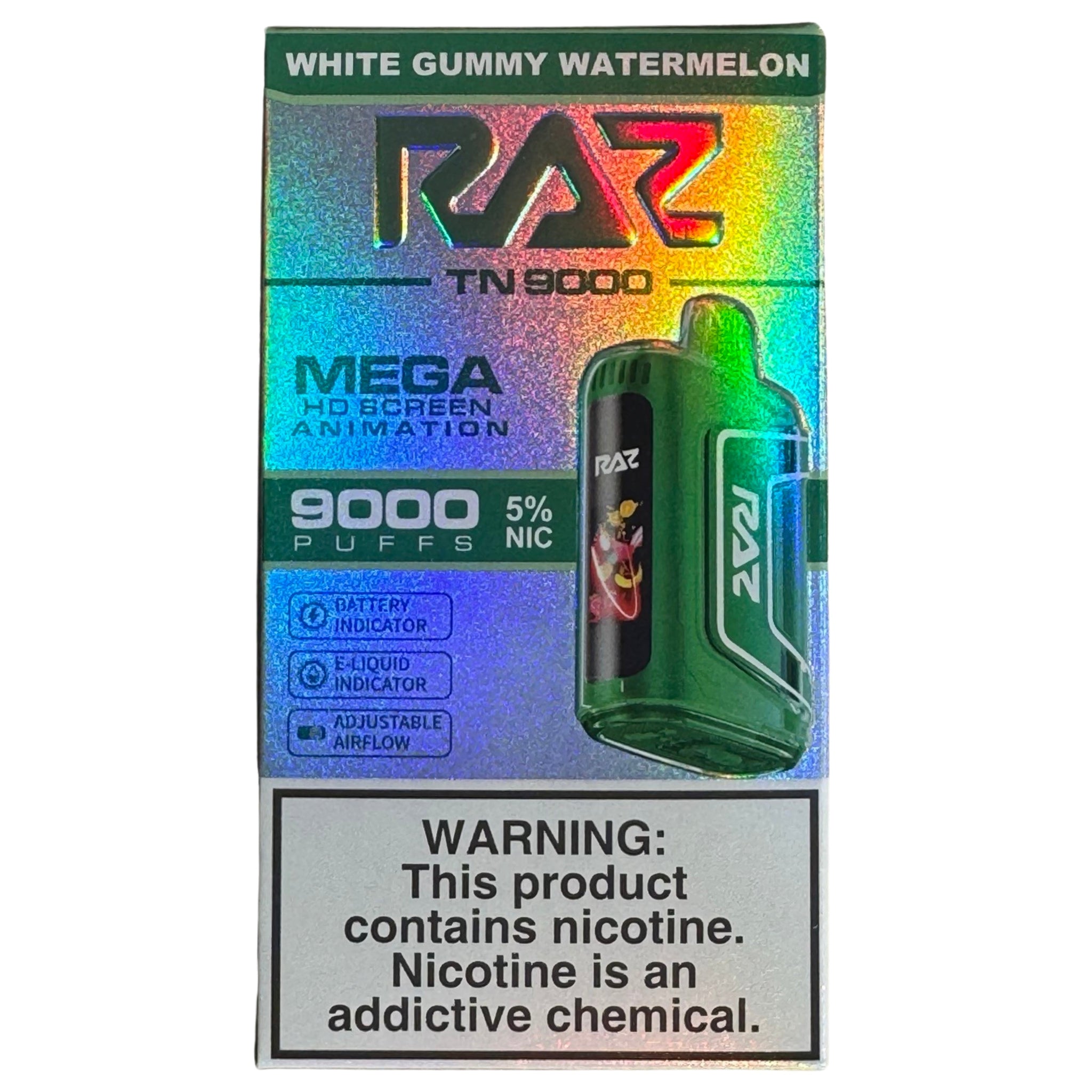 - Power Personified: Equipped with a robust 650mAh battery and USB-C Type Charging, the White Gummy Watermelon - RAZ TN9000 redefines convenience. Say farewell to the woes of frequent charging and embrace seamless power that keeps pace with your lifestyle.
